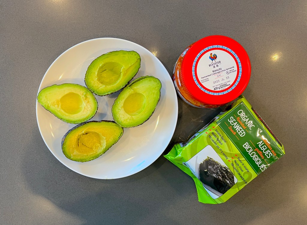 Here are some of the key points of this recipe. The recipe gets its creaminess from the mix of avocado and mayo. You can always add less mayo or use a lower-fat version to cut some of the fat out. You can adjust the heat level by adding less or more hot sauce. Costco carries a great line of dried seaweed. It has been approved by both my kids and my Korean in-laws. If you aren’t familiar with kimchi, it is a fermented cabbage that includes Korean spices and lots of garlic. Rooster is a great brand and is readily available in most Asian grocery stores (I’ve even seen it at my local No Frills!). Pro tip: Once the jar has been opened, put it in a grocery bag (or two) before storing it in your fridge. Otherwise, it will cause your other food to smell.