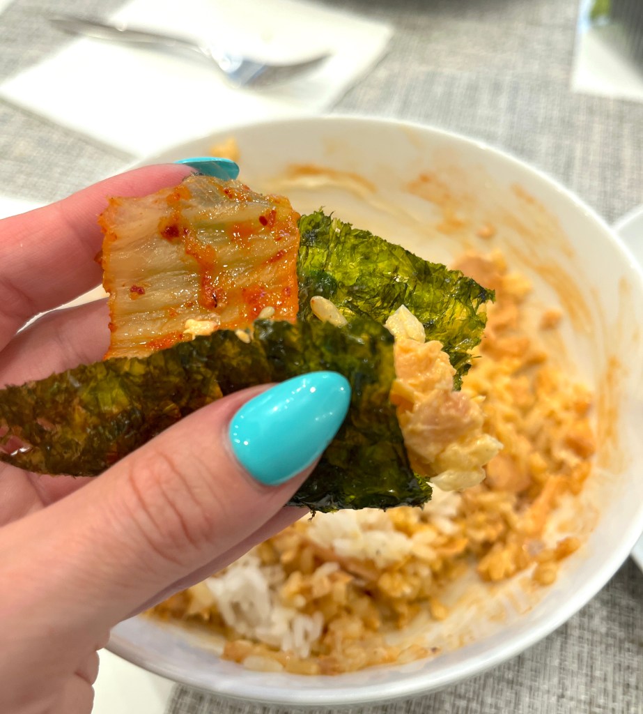 Use the seaweed to pick up bitd of the salmon/rice mixture. Eat with avocado and kimchi.